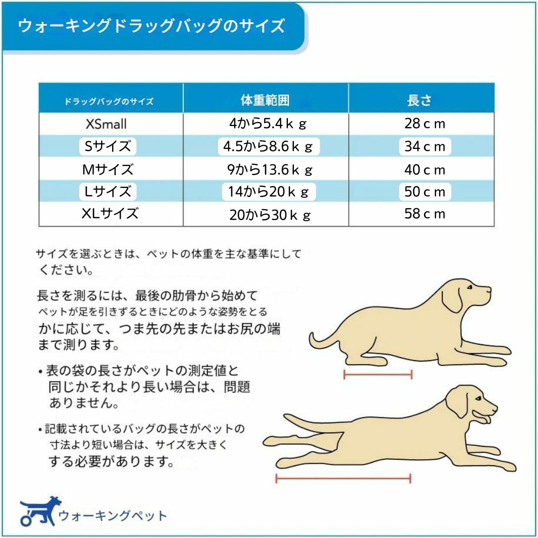表の「長さ」は目安です。犬種によって体型が大きく異なるため、まずは体重を最優先に選んでください。