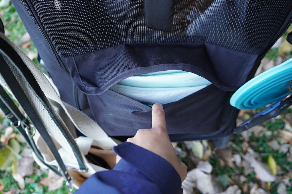 背面のポケットは横のポケットよりも大きめ、マチがあるので出し入れもしやすいです。ここはおもちゃを入れたり、スマホを入れていることが多いです。サッと取り出せるのでかなり重宝しています!