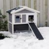 屋外でも室内でも使用できる耐久性のある木製キャットケージが新発売。 猫ちゃんのために設計された屋外でも室内でも使用できる耐久性のある木製キャットケージが新発売。スロープ付きの2階建てになっています。 2ウエイのキャットドア付。ハウスの裏側にもキャットドアがついています。金属ロック付きのドアがついていて屋根部分がアスファルト屋根仕様で耐候性仕上げの耐久性のあるデザインに仕上がっています。 断熱材入りなので寒い地域でも暖かく過ごせるハウスです。 サイズ:78 × 55 x 75 cm