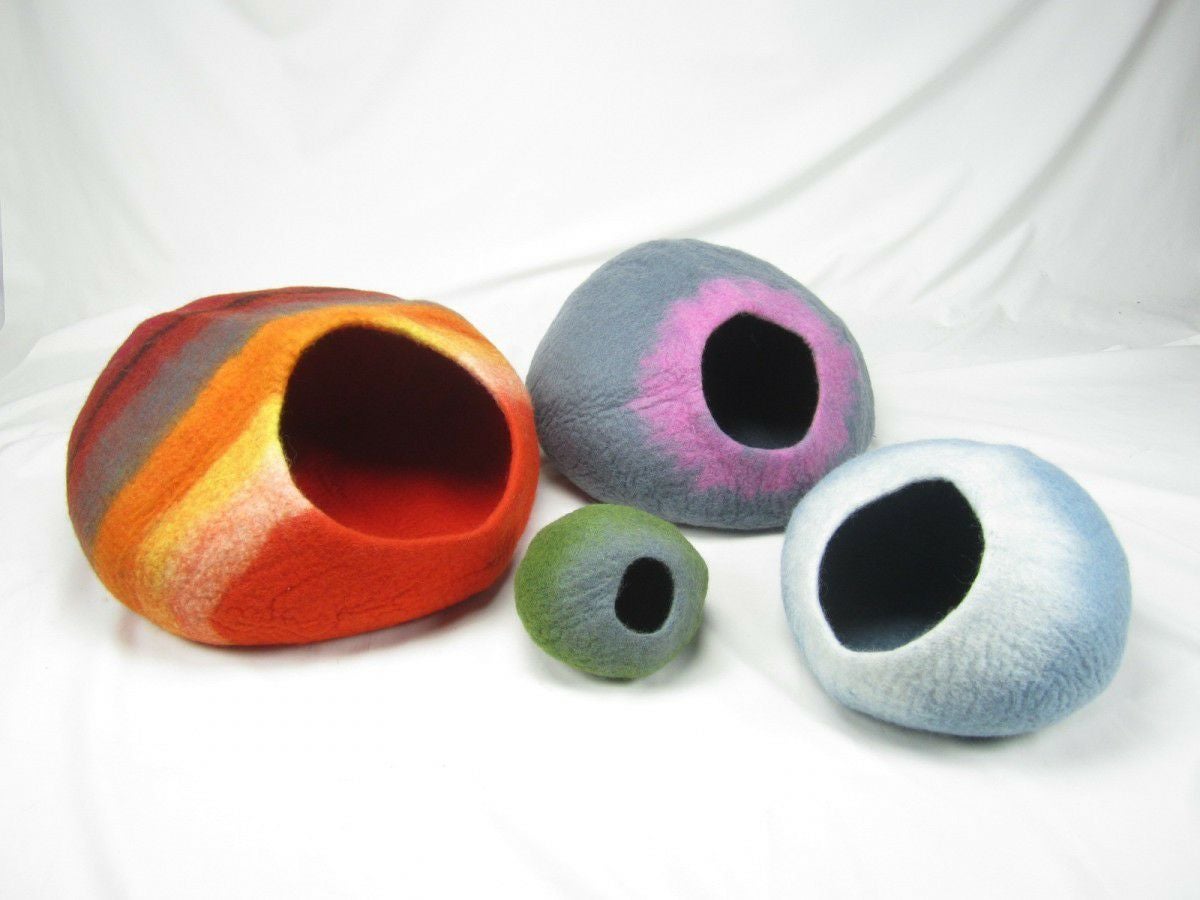 ふんわり包み込む、アメリカ生まれのウール手作りぽかぽかベッド — あなたの猫に極上のぬくもりを!ねずみさんの顔デザイン 猫用 ベッド ダルマドッグカルマキャット マウスケイブ ブルー