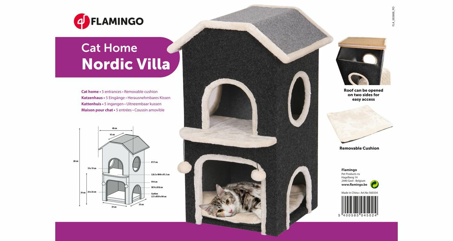 ヨーロッパで人気のペットメーカーFLAMINGOPET!最大5個の入り口がある2階建てのキャットタワー兼ハウスです。フェルトで覆われたベッドがあり、両サイドに取り外し可能なクッション完備。屋根も含んだレストエリアを完備したタワーです。正面2階からおもちゃが2個ぶら下がっています。 サイズ39×39×80cmbr>