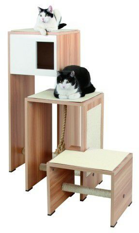1962年からペット用品を製造するドイツのペット用品ブランド。 ねこカフェなどでも人気の自由に組み替え可能なキャットタワーです。 3段階の高さのタワーがセットになっていて一番高いタワーには隠れ家、2番目に高いタワーにはロープ紐のおもちゃがついていてそれぞれ側面に爪とぎがついています。 それぞれのタワーの下には麻が巻かれた爪とぎがついています。 それぞれに切れ込みが入っていて順番に並べたり、真ん中だけ高くしたりなどインテリアに合わせて組み換えして頂けますので、猫ちゃんも飽きずに遊べると思います。 サイズ: 高さ: 100 cm 側面についている2個の爪とぎの大きさ: 42 x 25 cm 隠れ家部分のサイズ36 x 35 x 28 cm 【キャットタワー、キャットファニチャー、プレイボックス、キャットトイ、爪とぎ、スクラッチ、猫おもちゃ】