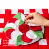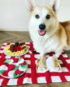 イタリアの饗宴という名のスナッフルマット。マンマ・ミーア!!!イタリアの饗宴のようにテーブルクロスに並んだトマト、フレッシュモッツァレラチーズ、バジルのサラダとワインのボトルにおやつを隠して遊びましょう!!