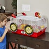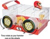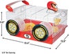 【アメリカMIDWEST】アメリカミッドウエスト社ハムスターケージです。 普通のハムスターケージと違い付属のパーツで非常に面白いハムスターケージが完成します。こちらはレースカー仕様のケージです。 ハムスターホイールに外付けでタイヤが取り付けられることによってハムスターちゃんがホイールで遊ぶたびにタイヤがくるくる回ります。 ケージの入り口はトップにあるのでそこから出入り可能です。人とは違うハムスターケージを御所望の方は是非! サイズ35.1 L x 49.2 W x 24.8 H cm、重量2kg、Includes: (2) Exercise Wheels, Water Bottle, Food Bowl, Hideout Hut, Clip-on Art, and Decals