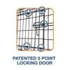 2ドアトレーニングリトリートは、特許取得済みの5点ロックシステムを備えており、ドア全体の強度と安全性を高めます。これにより、ペットが安全に過ごせます。