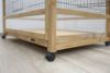 1962年からペット用品を製造するドイツのペット用品ブランド。 幼稚園や学校、保育所でもオススメの室内で使えるラビットケージです。正面とサイドには敷き詰めた藁などが飛び散らないようにプレキシガラスがついています。そのため中のうさぎちゃんなどの様子がよく見えます。お掃除しやすいように高さ2cmの引き出しがついていて、天井部分も大きくオープンできます。移動が簡単にできるようにロック付きキャスターがついています。本体:無垢の木製、保護用の木の色。 サイズ26 x 75 x 70 cm