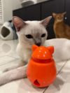 起き上がりこぼしのようなおもちゃにキャットニップやドライフードを入れて鼻先で触ったりパンチすると中からフードが出てくるというおもちゃです。