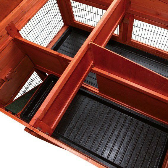 ※同梱不可ドイツの有名ブランド!トリクシーは世界中で販売されている人気ブランドです。 全部で7個のドアがついたほぼ立方体の2階建てのラビットケージです。 前後に仕切りで別れているので多頭飼いでも大丈夫です。 艶出しされた松を使用しています。 屋外の悪天候でも耐えれるようにアスファルト屋根になっていて天井はオープンできます。 1階と2階への往来はスロープで移動できますが使用しないときははしごを2階部分に収納可能。 1階のサークルへスロープで移動。 雨が降っても上に小屋があるので雨にぬれずに遊べます。 ハッチ部分はロック可能。 背面部分には換気を調節できる窓がついています。 網の間隔は2cm