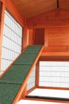 ※同梱不可※ドイツの有名ブランド!トリクシーは世界中で販売されている人気ブランドです。 2階建てのラビットケージです。 艶出しされた松を使用しています。 屋外の悪天候でも耐えれるようにアスファルト屋根になっていて天井はオープンできます。 2階部分は寝室とリビング。1階は雨をしのげるサークルで囲まれた遊び場になります。 1階と2階への往来はスロープで移動できますが使用しないときははしごを2階部分に収納可能。 お掃除しやすいように引き出し式の板がついています。 ハッチ部分はロック可能。 背面部分には換気を調節できる窓がついています。 網の間隔は2cm