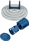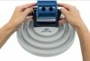 上にある筒をくるくる回転させておやつを取り出す知育玩具です。 おやつが落ちる下の部分は溝がついた板になっていて、そこから取り出すのもまた遊べるおもちゃです。 早食いできないような工夫です。おやつの出る穴は調節可能になっていて大きい穴、一つ穴、二つ穴にできます。 本体の底にはラバーのすべり止めがついているのでフローリングの上では固定されます。 サイズ直径28cm