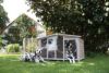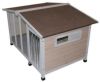 1962年からペット用品を製造するドイツのペット用品ブランド。プレキシガラス仕様で犬小屋にたくさんの日光を取り入れることができる画期的な超大型犬用犬小屋 ドッグハウスが登場!今まで見たことがない犬小屋の正面の壁をプレキシガラスにすることによって、天気がいい日には太陽の光を十分取り入れることができ、雨の日も木がのように濡れる心配もなく常に視界がクリアなので、わんちゃんも驚くかもしれません。 もちろん防寒もばっちり。ドア部分にも雨や風を防護するビニール扉を標準装備。両サイドには室内の温度を調節するためのスライド小窓がついています。 アスファルト屋根仕様なので全天候型。片側が大きくオープンしますのでお掃除も簡単です。置く場所によって高さを調節できるプラスチックアジャスタブル。至れり尽くせりのプレミアムドッグハウスです。 ドアサイズ:50 x 33 cm 内寸:124 x 75 x 67 cm 外寸:134 x 92 x 82 cm