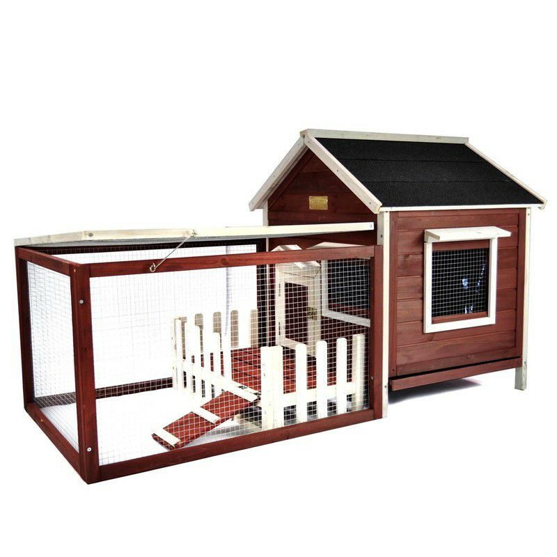 ※同梱不可アメリカでベターでシンプルないいものを供給している有名USAペットブランド! 海外のログハウス風のテラス付きうさぎ小屋とサークルのセットです。 環境にやさしく、耐虫性が高く(害虫がつきにくい)、耐腐性も高い植物であるモミの木材を使用してきれいに作られています。 魅力的な赤褐色のラビットケージはおしゃれでどんなお家にもマッチします。 床が地面から高くなっているので地面からの熱や寒気から保護します。 屋根を全天候型耐性にするためのアスファルトコーティングが施されています。 2から3匹までのうさぎちゃんに理想的なケージです。 掃除しやすいように飼育小屋にはプラスチックの引き出しがついています。 正面のワイヤー部分と寝室にもそれぞれロック付きのドアがあります。 寝室から伸びたスロープでアウトドアランエリアにも簡単に移動できます。 ケージ自体にもロック付きのドアがついています。 サークルの上部もオープンできます。 ◎サイズ     幅:147.3cm高さ:83.8cm奥行76.2cm