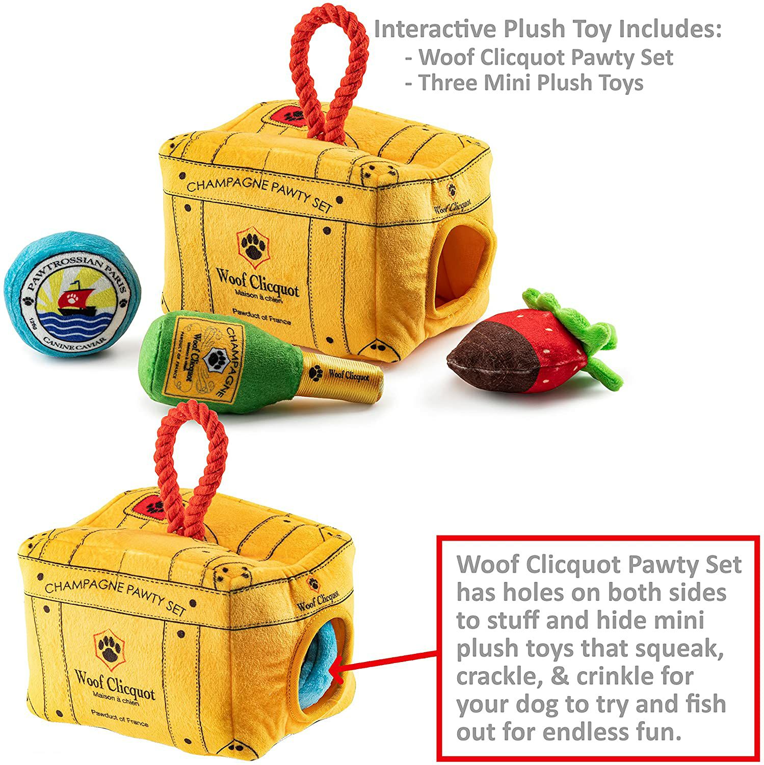 最も人気があり、最も上品な子犬に優しいシャンパンを備えた、Woof Clicquot Pawty Setは、子犬を何時間も楽しませ続けること間違いなしです! この巣穴のおもちゃには、3つのかわいいピクニックポーティぬいぐるみが含まれています。
