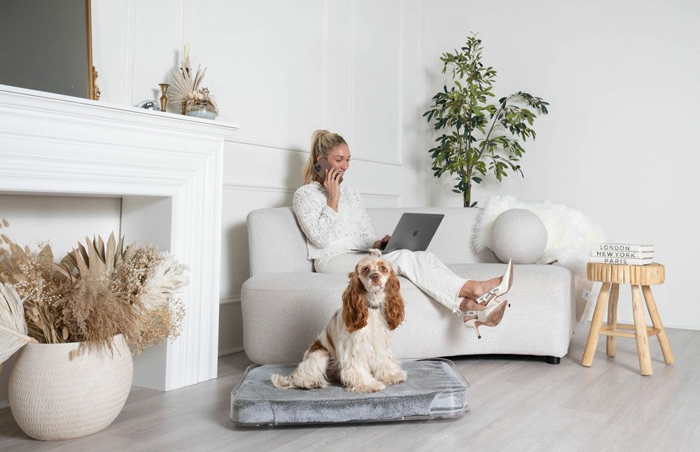 モダンなペットベッドには 2 つのサイズがあり、コアラ グレーとバニラの 2 つの異なる色のクッションからお選びいただけます。