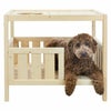 小型犬ちゃんと猫ちゃん用に設計されたインドアホームです。小さなペット用のベッドとラウンジのプラットフォーム。DIYで塗装することもできます。天井部分は取り外しできて、取り付けた時でも頭を出せるホール付き。艶をかけられた頑丈で持続可能な松でできています。エコとペットにやさしいウォーターベースのステインで処理しています。
