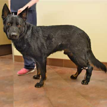後肢の「ナックリング(爪を立てずに歩く)」や引きずりを改善するためのリハビリ補助具。