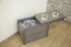 アメリカニューエイジペットは株式会社ALLFORWANが日本総輸入販売代理になっているブランドです。日本メーカーの商品ではほとんどない大型犬や超大型犬やうさぎ小屋などに特化したオリジナルのEcoFlexというエコ素材を使用したペットメーカー! ecoFlexとはリサイクルポリマーと木をブレンドして作られたエコ素材で、その特徴は全天候型(気温と湿度の変化に対応)、腐敗しにくい(腐りにくい)虫が寄ってきにくい、常に形状が安定しているという特徴があります。またねじれにくい、曲がりにくい、ひびが入りにくいなど様々な特徴があり、中のわんちゃんを傷つけることがありません。 エサ入れなどのストレージとフードボウルスタンドがセットになったダブルダイナーです。ecoFlexでできています。大型犬ちゃんサイズの餌台、餌入れです。普段はそのまま食器台として大型犬ちゃんなどの首の高さに負担がかからないような高さになっています。 ストレージ自体におもちゃやドッグフードなどを収納でいるボックスになっていてスライドしてフードボウルを取りつけて側面のロックでしっかりと取り付けできます。 フードボウル自体も3段階に高さを調節できる可変足つきで、わんちゃんの体の高さに合わせて足を折りたたむことによって3段階に調節できます。 サイズ:39.6 H x 54 W x 30 Dcm 32OZのボウルが2個