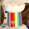 明るくカラフルな虹のデザインをベースに、白いふわふわの雲をボウルにした高台のボウルです。