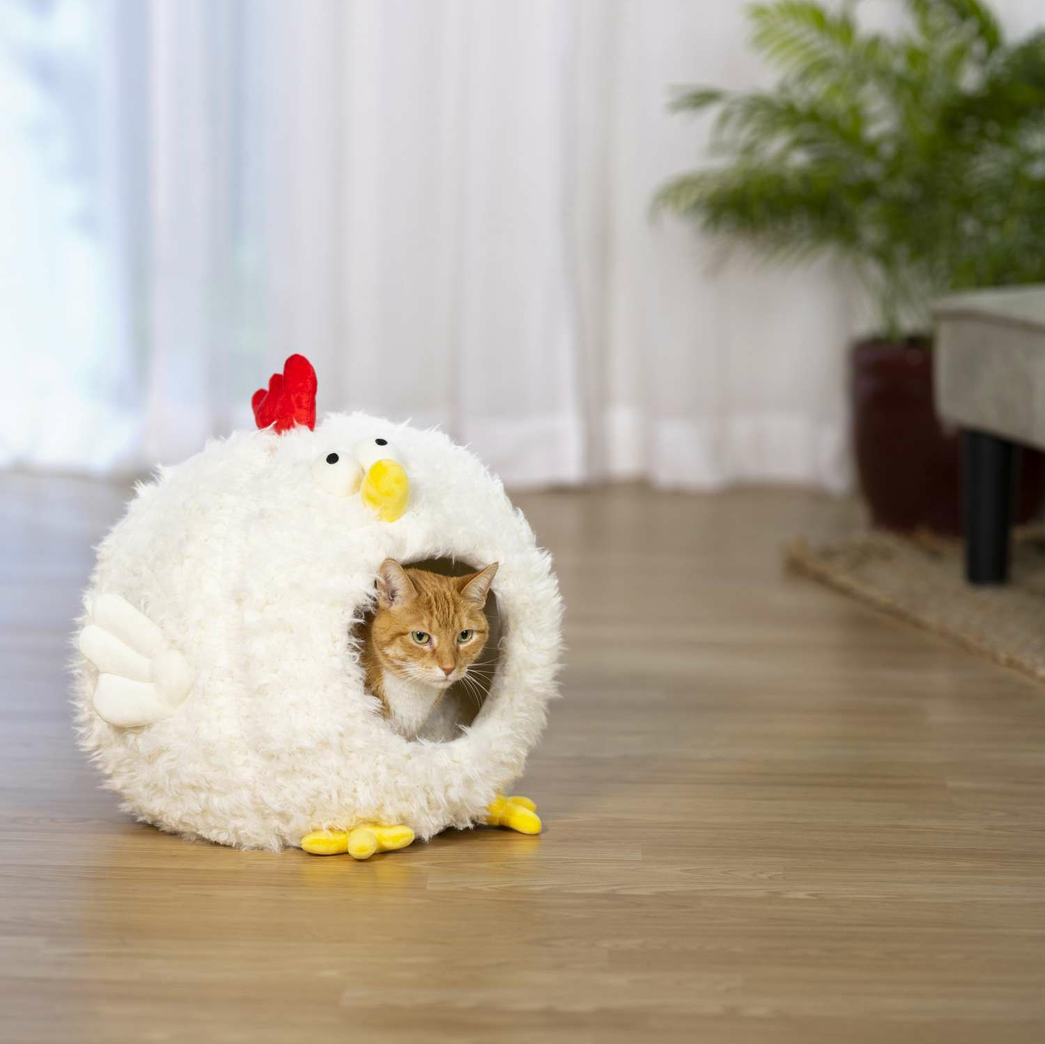 Comfy Chicken の外装は、黄色と赤のアクセントが付いた短い毛むくじゃらの白い生地で覆われています。