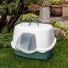 水が下に流れるようなデザインのトップキャノピーと便利な持ち運び用ハンドルを備えた屋外のフード付き猫用トイレ。 幅広で丈夫、お掃除もラクラク。