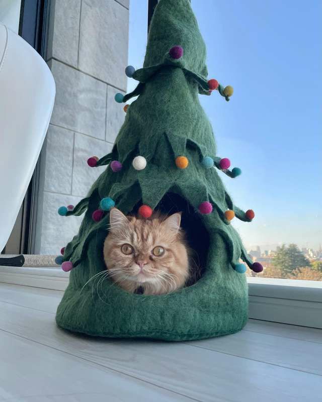 ふんわり包み込む、アメリカ生まれのウール手作りぽかぽかベッド — あなたの猫に極上のぬくもりを!クリスマスツリーデザインでめっちゃおしゃれ 猫用 ベッド ダルマドッグカルマキャット クリスマスツリーケイブ ブルー クリスマスツリー