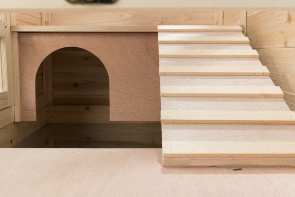上下運動が得意なデグーには、高さのあるケージとステップ(足場)を。強力な齧り癖にも耐えうる、天然木やECOFLEX素材の丈夫なハウスがおすすめです。