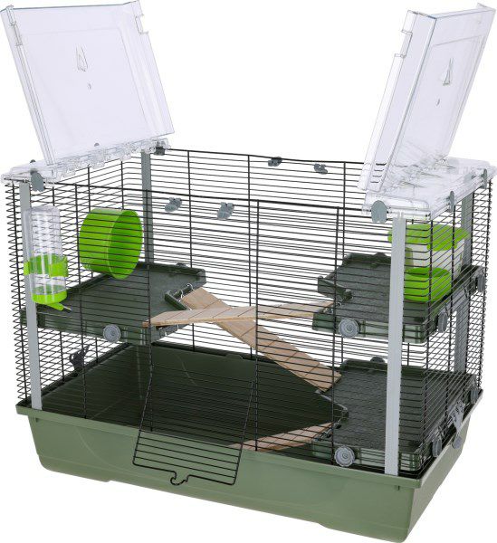 A. 個体差はありますが、幅60cm以上の広めなケージをおすすめします。海外製の大型ケージなら、巣箱や大きなホイールを置いてもゆとりを持って過ごせます。