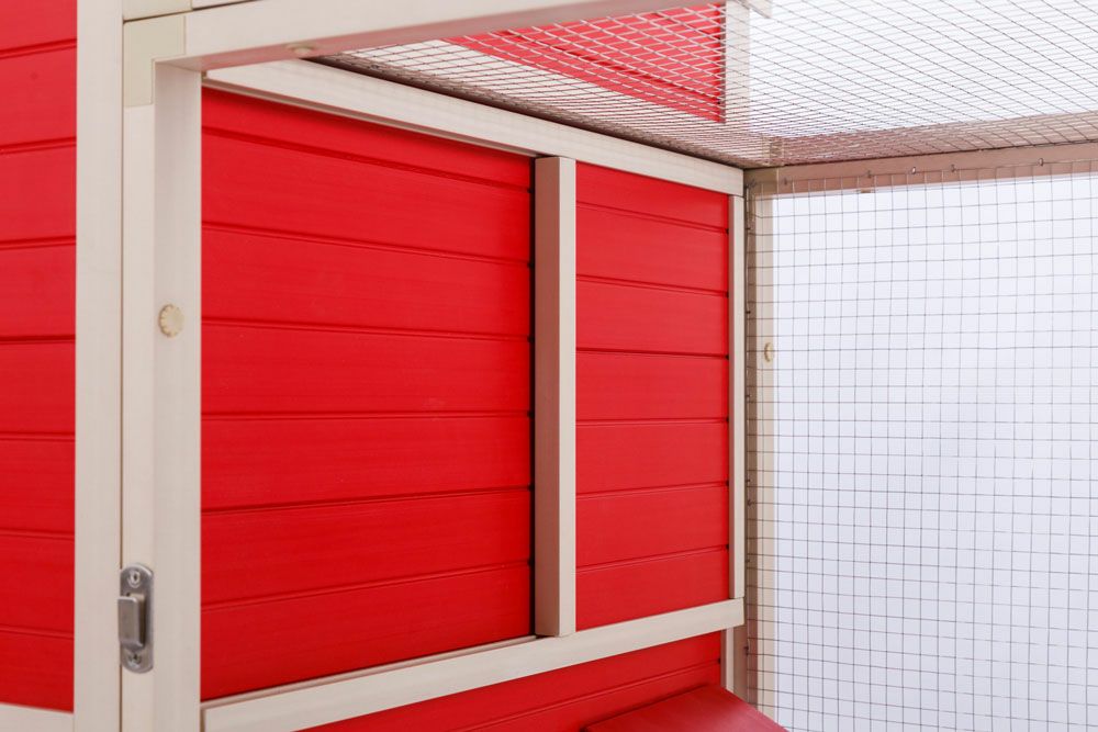 最上階には、メインの小屋への1つのドア開口部と、サークルへのスロープへのアクセスを可能にする開口部があり、日陰の芝生のエリアにアクセスできます。下部のサークルエリアには、捕食者に強いラッチで固定された玄関ドアがあり、NeveRust™ステンレス鋼ワイヤーメッシュを使用して構築されており、何年にもわたってメンテナンスフリーで使用できます。 組み立てが簡単で、掃除が簡単で、愛するのも簡単です。