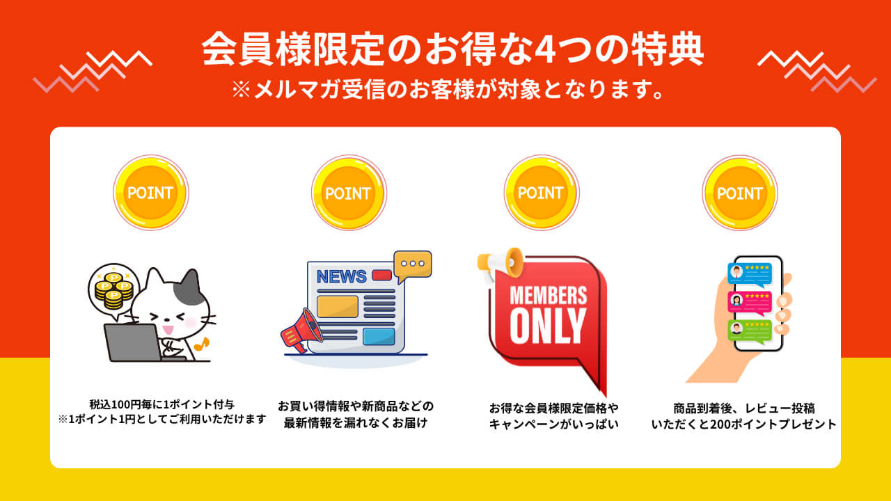 メールマガジンをご購読いただくと、新製品やセール情報をお届けします。またメールマガジン限定クーポンやプレゼントなどお得な情報をお届けします。